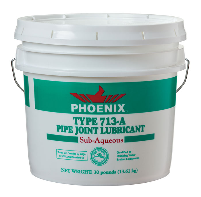 Phoenix 713-A has a soft paste consistency and tan color, and it can be used from 10° to 110°F. Phoenix 713-A can be used on all types of pipe including asbestos cement, cast iron, concrete, plastic and clay. It will not deteriorate natural rubber, synthetic rubber or plastic gaskets.